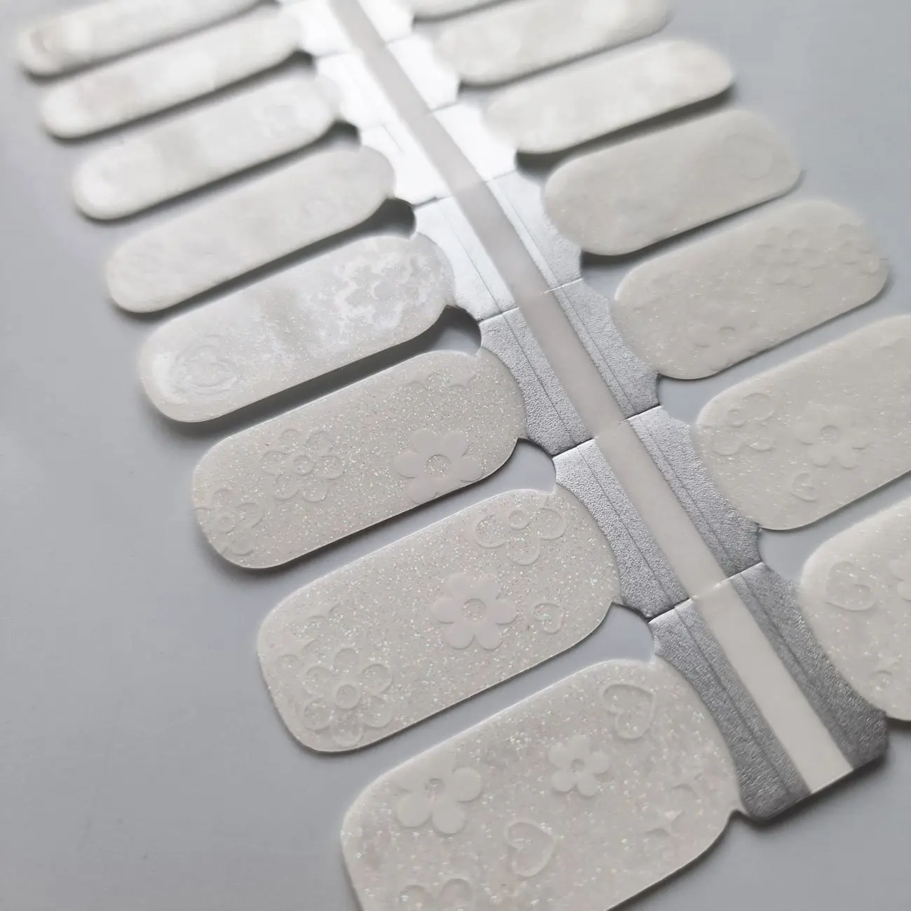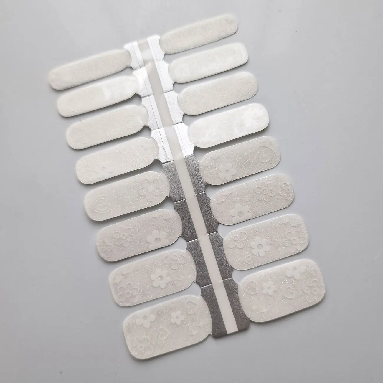 Pakuotėje yra vienas nagų lako lipdukų rinkinys. Rinkinį sudaro 16 skirtingų dydžių lipdukų